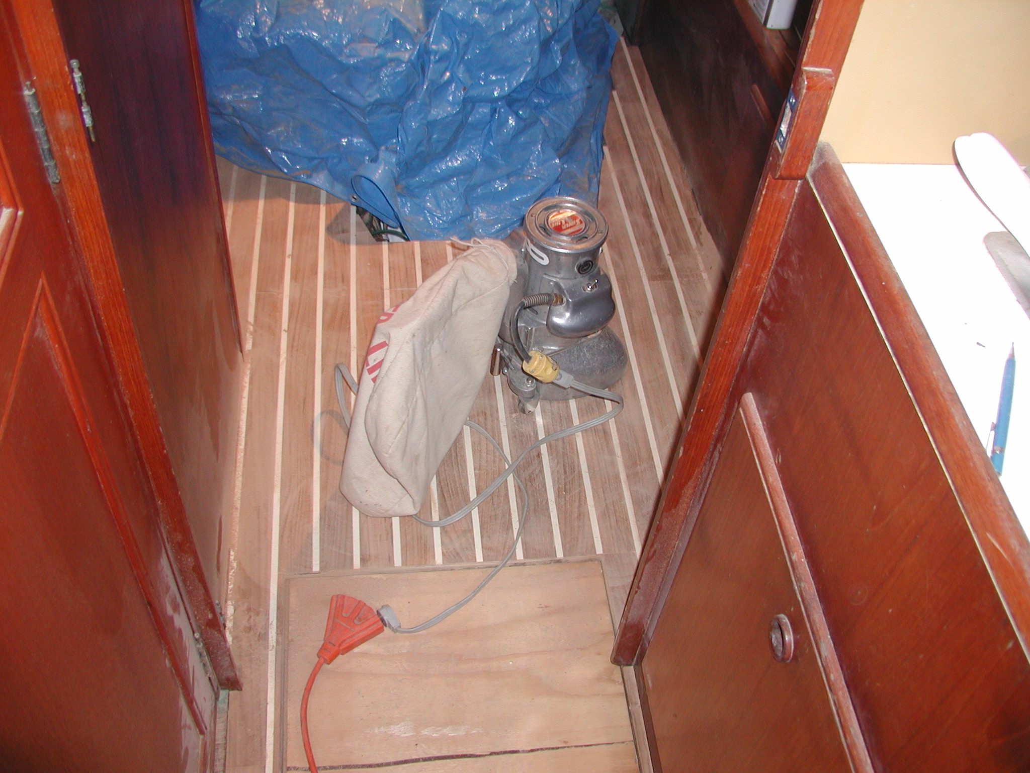 Next, I trimmed the two hatches and fit them into position in the cabin sole. I had previously removed the pull rings and ordered replacement pulls from West Marine. These also latch the hatch closed, a nice feature if you ever expect to take your boat offshore. Since the latches have not yet been received, I left a screw in position in each hatch so that they could be lifted after positioning them. I removed them when applying varnish and temporarily replaced them with plywood panels. Using an edger floor sander that I rented for the day, I smoothed the surface using a 60 grit paper. Even though I tried to make each floor piece precisely the same thickness, they didn't lay evenly. The surface was uneven and the face of each board had scroll marks from the table-saw. The floor sander was well, too well in fact. I found that the fine-grade sandpaper was more than enough to smooth the rough surface. It was worth the $30 rental fee. It had a bagging attachment that captured about 90% of the sawdust. I followed with a large random-orbit sander with 120 grit paper. Click on the photo below for a larger image. |