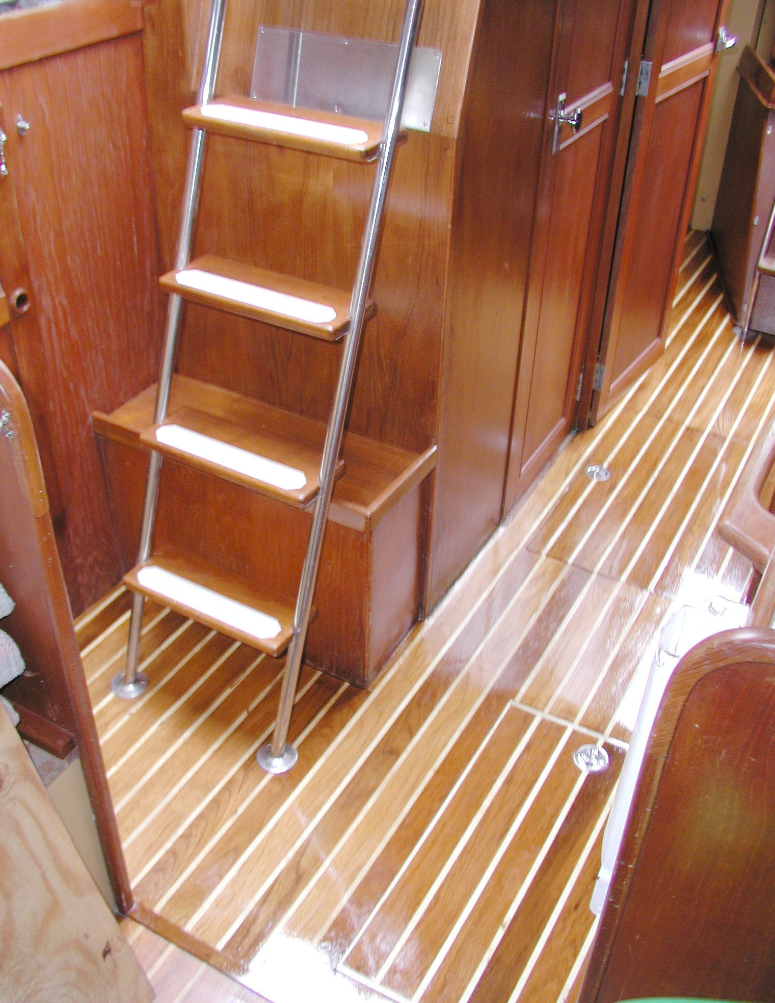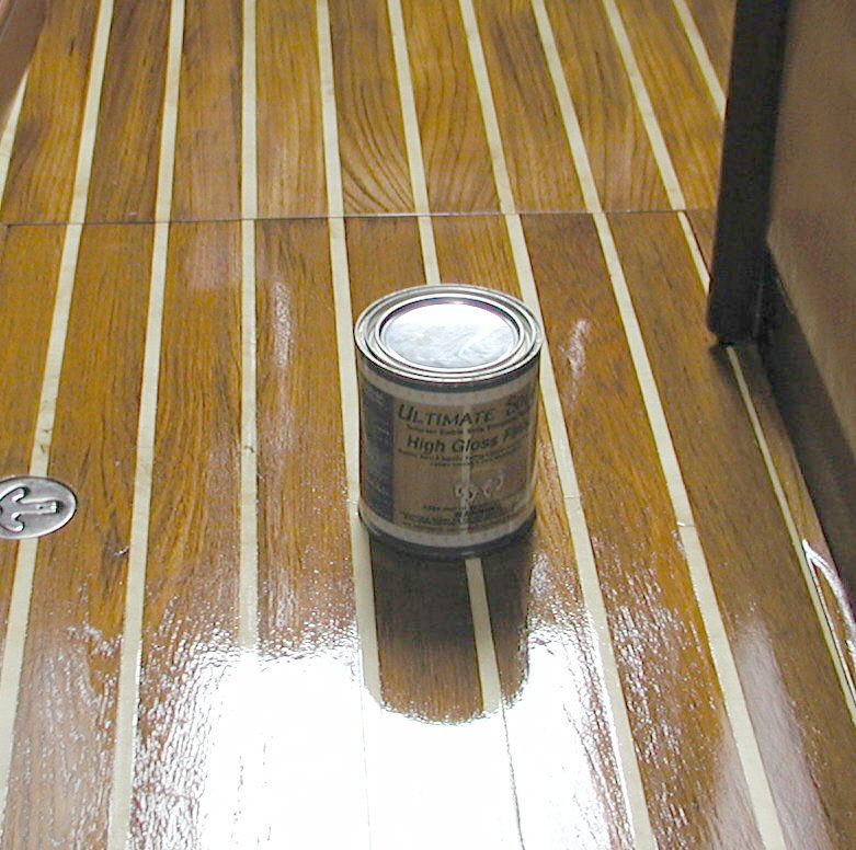 I did some online research about finishes and found that there is a trade-off between ease of application and quality of finish. The higher quality finishes retain their original color but require care when applying to avoid brush strokes. They are typically sensitive to temperature and humidity when applied. Since I am working during the winter layup period, it is very difficult to control temperature and humidity. An easy to apply finish will dry quickly, not require sanding between coats, and will pull brush strokes out between coats. These are oil modified urethanes, the most common of which is Minwax. Most of these yellow with age, a process called ambering. This is the result of the oil oxidizing with age. The interior finish in my boat shows signs of ambering. In some areas, the finish is dark brown. I consider this kind of finish to be too dark for my taste. There are some custom finishes that use special oils and resist ambering. One of these finishes is Ultimate Sole. After letting the sanding sealer dry overnight, I buffed it with 220 grit sandpaper and applied the first coat of Ultimate Sole varnish using a good foam brush. Directions stated that the varnish would dry in about 5 hours, but I found that it took more than 24 hours for the first coat to dry and the second coat refused to dry. I stripped off the finish and repeated using Epifanes and got the same result. I stripped it again and waited for the weather to warm up before repeating with Ultimate Sole finish and got great results. The finish is clear in color and very durable. This leaves the holly white and the teak light brown. I can't describe the difference that the finish makes to the cabin. It brightens up the cabin and makes the whole cabin glow. Unfortunately, it highlights remaining flaws in the forward half of the cabin sole that didn't resurface. I stripped and refinished that section using the same finish used for the new sole, but results are less than I had hoped for. The paint stripper used to remove the old finish wicked up under the masking tape and damaged the finish on the lower inch along the bulkheads. I ended up adding floor molding to cover the damaged bulkhead finish. Click on photos below for a larger image. |