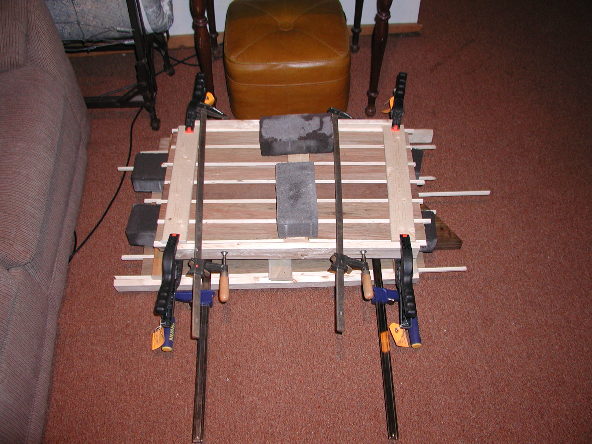 Cutting wood like this is not difficult if you have a good table-saw and a sharp blade. You need to have a fairly large motor on your table-saw to rip teak. It can be very difficult to cut and is abrasive to cutting tools. A carbide-blade is a must. I purchased a new carbide combination blade for my table saw. The saw blade was precisely 1/8" thick. This proved to be a good investment since I had a lot of cutting to do. We milled the teak into 2 3/16" boards, then cut them into three ¼" thick planks. Cutting the teak was straightforward. As always, we were very careful when running the table saw. Since the boards were so thin, I had to be extra careful. I frequently counted my fingers to make sure there were still ten. I adjusted the fence to the appropriate position and ran the boards through using push-sticks. My wife or daughter helped guide the wood. Holly was cut into 3/8" strips. Since the planks were so much thinner, the wood was more difficult to control. I originally planned to tongue-and-groove the planks, but I found the holly too difficult to control for such a precise cut. I left the edges straight. Taking about 6 hours, we cut about 30 boards each of teak and holly, each about 7 feet long. This turned out to be just enough to finish the job. I had about half a board left after completing the job. I removed the two floor hatches and resurfaced them first. I removed the pull-rings and filled the holes with epoxy filler. Using a belt-sander, I removed the finish from the hatches. I purchased a small container of parquet flooring mastic and used it to glue floor planks that I cut to match the existing pattern. I clamped and used weights to hold the wood strips in place while the mastic dried. Click on the photo below for a larger image. |