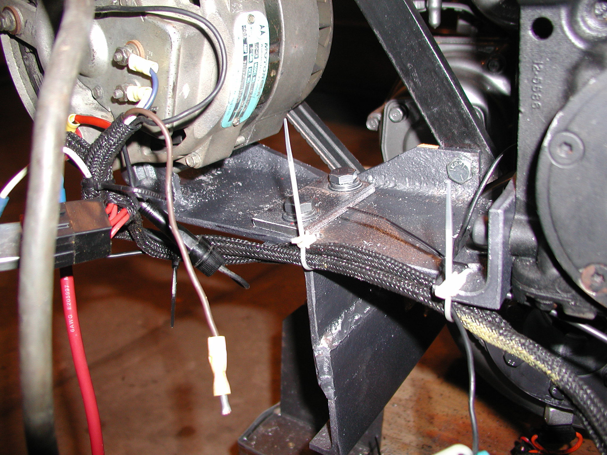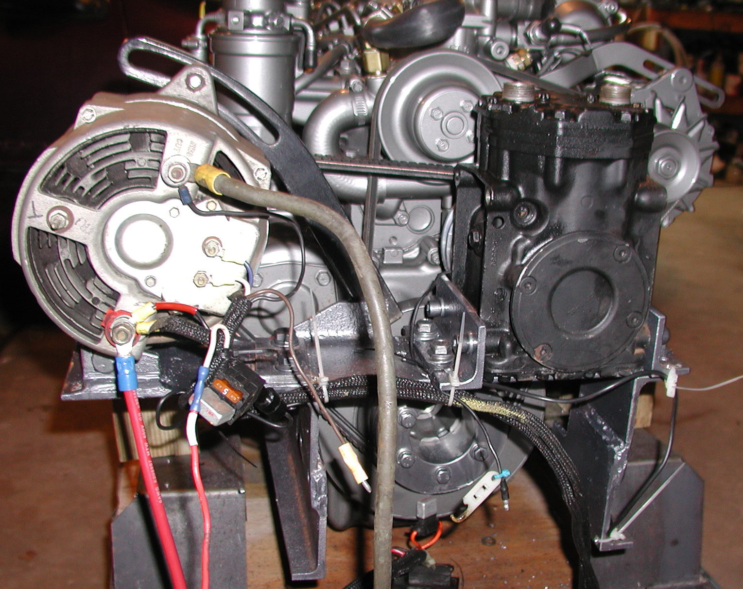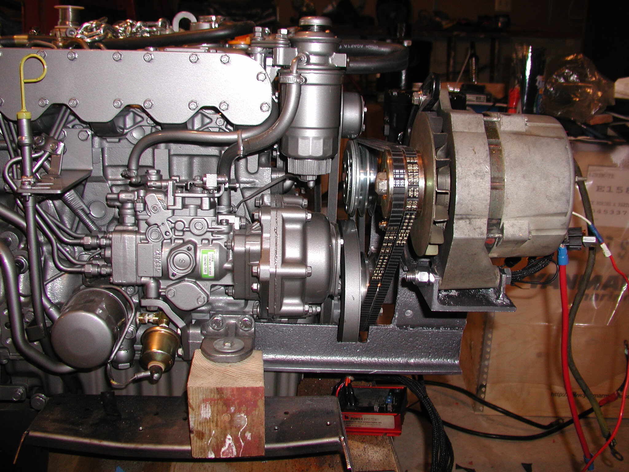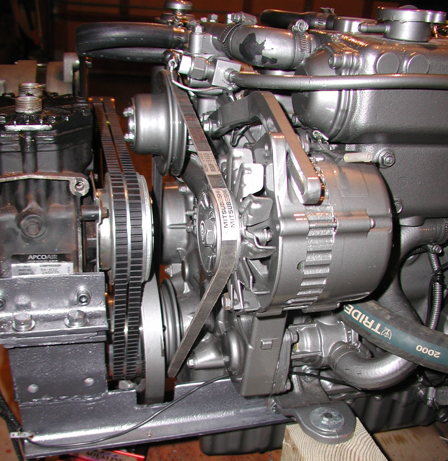 After cutting all the pieces, I positioned and clamped them to be sure about alignment and clearances before fastening the pieces together. I had to cut a small aluminum stud off the left side of engine beneath the fuel pump. This stud was unused and won't be missed. If the accessory pulley that I ordered had the pulley built with the sheaves a little farther from the engine, it would have been easier to position the refrigeration compressor. As it turned out, I had very little clearance below the water pump pulley. This would not have been an issue if the compressor could have been mounted about ¼ inch farther from the engine block. I arranged the accessories so that the same belt length used for the primary alternator and water pump will work on the accessories. It is important to consider clearances around the brackets and engine parts to allow replacement belts to be slipped into position. I planned on mounting the exhaust water-lift to the left side of the engine compartment, so I had position the accessory mounting platform to the right to insure room for the exhaust system. I used a mig-welder to attach the top mounting flare piece to the side brackets. I suppose it might be possible to drill and bolt the plate into position and avoid the weld. I first tried this approach, but found it difficult to keep the plates aligned while drilling. It may have worked if I removed them and used a drill-press to drill the holes. Instead, I ended up welding them in place. My welding skills aren't very good. Persistence compensated for my lack of skills. In addition to welding the top flange plates, I also welded the back mount for the alternator to the mounting plate. This could also have been done by bolting a plate into position, but a weld was easier. I bolted the top plate into position rather than welding it. I expect to remove the top plate to make the engine narrower while passing the engine through the companionway hatch. I also figured that a drilled plate would allow some minor repositioning. After finishing fabrication, I removed the whole assembly and painted it with a primer and close matching medium metallic gray color. In total, I spent about 32 hours making the mounting platform. An experienced metal fabricator with proper tools could probably do it in half this time. I would expect a shop to charge at least $500 to fabricate something like this and there is no guarantee that it will fit as well as what I made. After much research, I found that belts come in two basic designs, one is designed to take a shock load and the other is designed to wear well. The first type is thinner. It avoids damage when subjected to a shock load by slipping slightly. They usually come with ribs on the outside to provide better cooling. They tend to wear out quicker, but rarely snap. The other flavor has a thicker construction and slips less. These belts frequently have ribs on the inside. Since they have more surface area in contact with the sheave, they don't slip as easily. When subjected to a shock load, they may snap. My multi-stage regulator puts quite a load on the alternator when it switches to the fast charge setting. One of my battery banks has a pair of large AGM batteries. This type of battery accepts a recharge rate much faster than conventional wet-cell batteries. When the alternator kicks into high gear, it puts a chock load on the belts. I've had belts snap on me. When they break, they can be thrown off the pulley with considerable force. As mentioned earlier, I broke my throttle cable that way. Balmar recommends the Green Stripe belt by Gates. This is a low-slip belt that, in my opinion, is not suited to shock loads. They also recommend the Dayco Top-Cog V-belt. In my opinion, this will last longer and be more reliable. Since the same belt will work in for the primary alternator or the auxiliary alternator, I ordered two spares instead of three. |