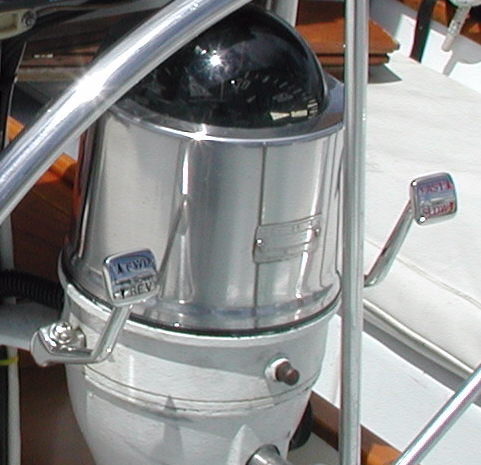 The Yanmar engine accepts the throttle cable from the back of the engine only. This means that the cable must be routed around the back of the engine and from there to the fuel pump. Since the old throttle cable was damaged, a replacement was needed regardless of engine choice. The binnacle on the boat is weathered and was difficult to disassemble. I removed the compass and the top of the binnacle. The cables clamp to a sleeve that fits inside the binnacle tube beneath the wheel. Here's a link to the Edson service bulletin that describes the process. The most difficult part of the job was removing the corroded screws. Soaking the threads in PB-Blaster helped, but I had one that refused to budge and had to be cut. I used a cutting disk on an electric drill to cut the stubborn screw. The action of cutting heated the screw enough so that it could actually be removed before the cut was complete. Since I had the pedestal opened up, I took the opportunity to replace the brake pads and handles. The brake pads look easy to replace, but they are difficult to hold. I dropped one of the old pads down the base when removing them. I had replacement pads, so this wasn't a problem. I figured that the chance of dropping one of the new pads while replacing it was about 100%. To avoid this, I drilled a hole in the top of each pad and tied them loosely together with a piece of string. That way, if I dropped a pad, it could be retrieved. I also dropped a washer that is on the brake screw. I didn't see it when I removed the shaft. This is an odd size. I had to fabricate a replacement by drilling out a brass washer. What a pain! Beware that you don't drop the washer when removing the screw handle. I also decided to replace the control handles. Edson makes nice replacements that are engraved with FWD-REV and FAST-SLOW. This makes it easier for an inexperienced crewmember to drive the boat. The old handles were frozen in place of course. I had to cut them off by slicing the sides with a cutting disk. The replacements have larger screws than the old handles. I had to drill out and retap the shaft holes. It took about 8 hours to replace the throttle cable and service the pedestal. |