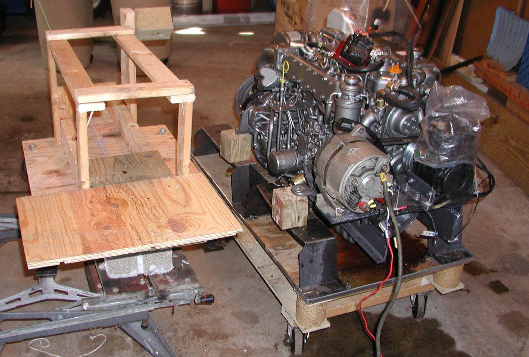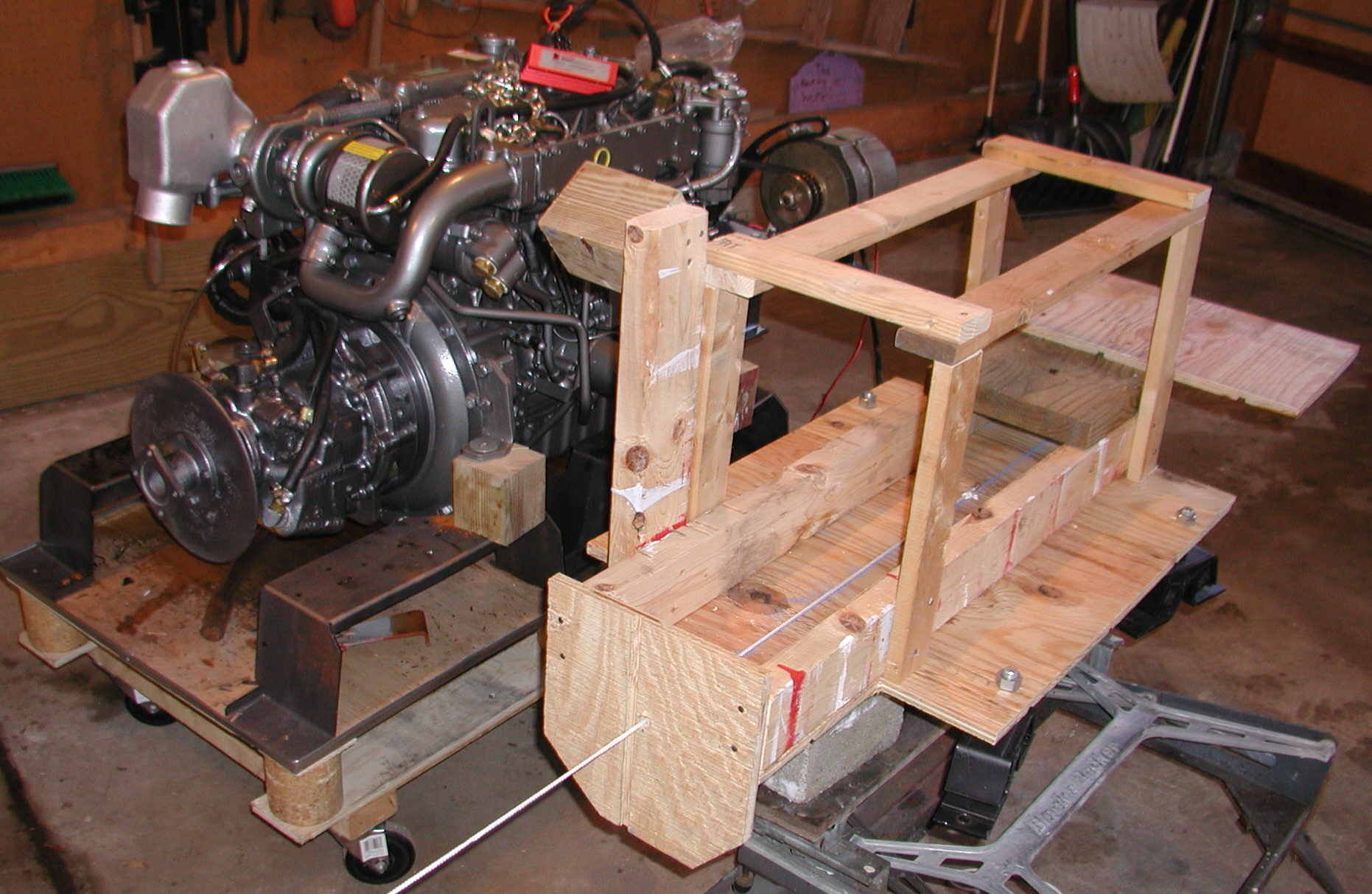 Research indicated that one key to a successful repower job is to build a good engine bed that properly aligns the engine to the shaft. The distributor sells steel mock-ups for this purpose, but they are available only in standard transmission configurations. I don't know if you can borrow or rent one, but this would be a sensible way to do business. In any case, since I was using a non-standard transmission, so I'd have to come up with my own mock-up. In order to make sure that I got the engine mounted right, I made my own mock-up of the engine. I reasoned that since the 424 used a V-drive in the drive train, engine alignment isn't as critical as a straight installation. Tolerances that I could achieve with a wooden mock-up would be good enough. There are a number of things to consider when positioning the engine. There is of course the alignment with the drive shaft. It is also important to insure that the exhaust system will have sufficient room and the engine room cover must fit back into position without having to cut holes in it for engine parts. No engineering drawings were available for the engine as configured with the SAE bell housing that I ordered. I had to take measurements off the engine after I received it. The engine mounts are all in alignment with the center axis of the drive shaft. I cut a piece of plywood that was large enough to cover the footprint of the engine. I drilled four holes in it at the appropriate position for each engine mount. Above that, I built a wooden box that approximates the size of the engine. There was a risk that the exhaust injection elbow would interfere with the engine cover, so I positioned a wooden block where the elbow would be. I attached a flat wooden plate where the transmission brake would be. This would be used to help position the engine. I added a flat plate at the front of the engine to simulate the position of the accessory mounting plate. This would allow me to verify that there would be sufficient clearance for the exhaust riser behind the engine. I drilled a hole in the center of the simulated brake disk and attached a screw-eye at the opposite end of the engine. This would allow me to draw a string through the engine mock-up down to the v-drive. If the mock-up is properly aligned, the string will pass through the center of the hole in the brake and then straight to the screw eye. The photo below shows the string through a hole in the simulated brake disk. My plan for aligning the engine is to first align the engine mock-up. Then make fine adjustments as necessary with the engine mount adjustments once the engine is in place. The engine mounts can be adjusted to the left/right approx ½" using a slotted hole on one end of the base, and can be raised/lowered about the same amount using adjustment screws. They can't be moved forward/aft, so it will be important to get the distance between the forward and aft engine mounts correct. The distance between the engine and the V-drive is not critical. It took about four hours to fabricate the mock-up. (Click on photos for a larger picture.) |