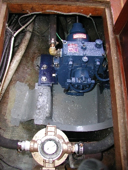 Attachment to the propeller shaft coupler is a little different than with the RV-20. The RV-26 uses eight fasteners rather than six, and they are in a different position. This means that you can't reuse the old coupler. The good news is that the eight bolts are easier to assemble because you can get a wrench on the nuts. The V-drive must be aligned with both the propeller shaft and the engine shaft. Alignment of the propeller shaft is done by adjusting the position of the V-drive in its pan. Alignment of the engine shaft is done by adjusting the position of the engine. Alignment with respect to the propeller shaft is critical. Walter specifies a tolerance of .003 inches. This must be done with feeler gauges. It is almost impossible to measure this kind of precision with feeler gauges. The output shaft is free to move while you attempt to measure coupling clearance at four points. I found it easier to manage if a couple of flange mounting bolts were left in place. They can be tightened until the flange is almost touching at one point, then the clearance can be measured at the other three points. I'm not sure that it is worth the effort to make a careful alignment when the boat is on-the-hard. The hull will flex when the boat is launched, likely changing shaft alignment. In fact, I had to fine-tune the alignment a few times after the boat was launched. Alignment of the V-drive to the engine is not as critical as it is with a standard installation. Walter provides an alignment tool that can be used to verify that the engine is mounted at the correct height. They do not specify a tolerance for this alignment, but they provide an alignment tool and directions. They specify that the engine should be aligned with the flexible drive shaft within 3 degrees as measured with a straightedge (1/8"). Replacing the raw-water strainer wasn't on my repower list. While jockeying the V-drive into position, I must have hit the strainer. It broke-off where a brass pipe nipple attached the strainer to the seacock. In retrospect, this was a blessing. If this had failed while underway, the consequences could have been severe. I replace the old strainer with a new Groco raw-water strainer and replaced the remaining hoses. Finding bronze nipples or tail-pieces on short notice proved difficult. I ended up using nylon tail-pieces as temporary substitutes until I could get proper fittings. |