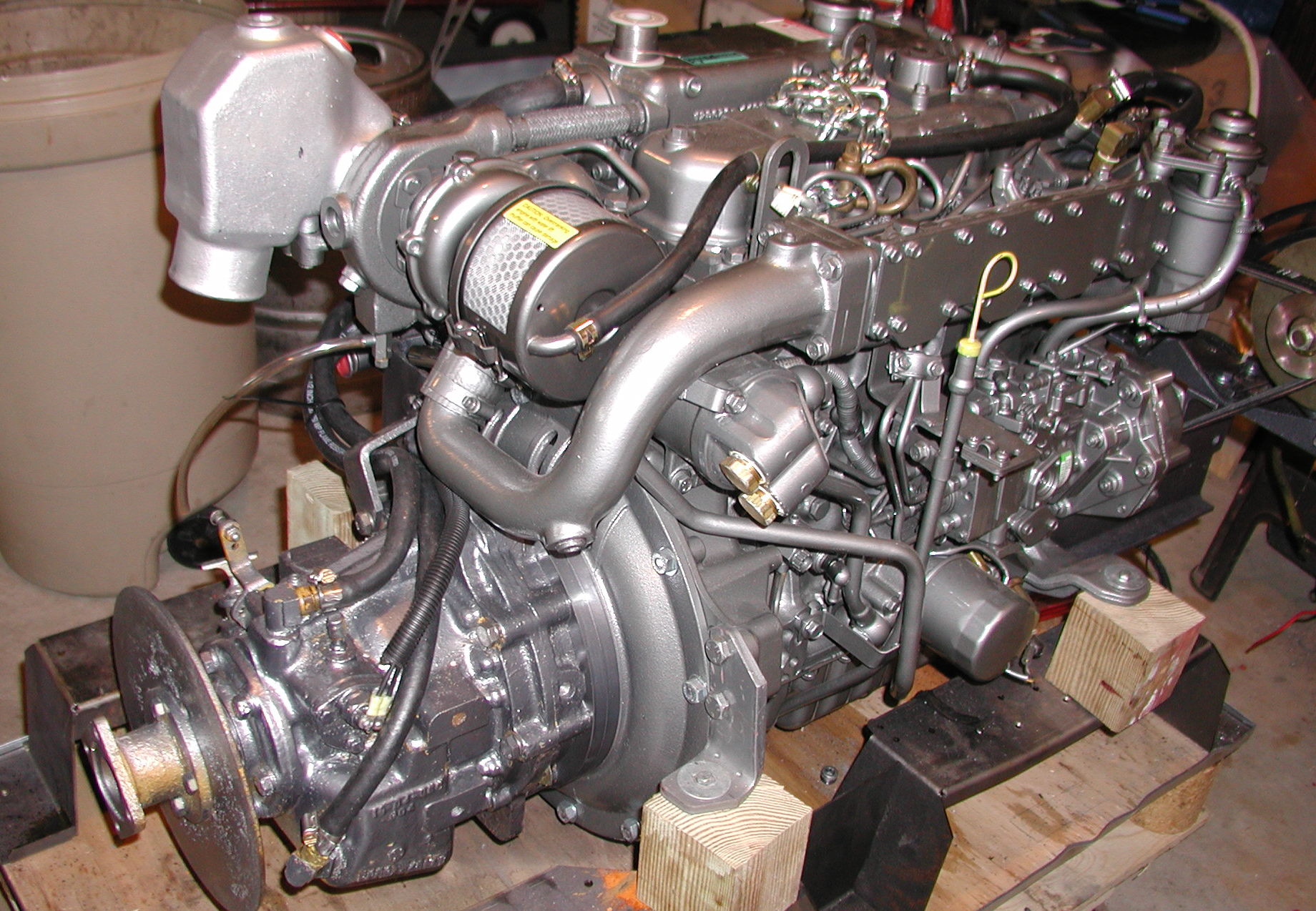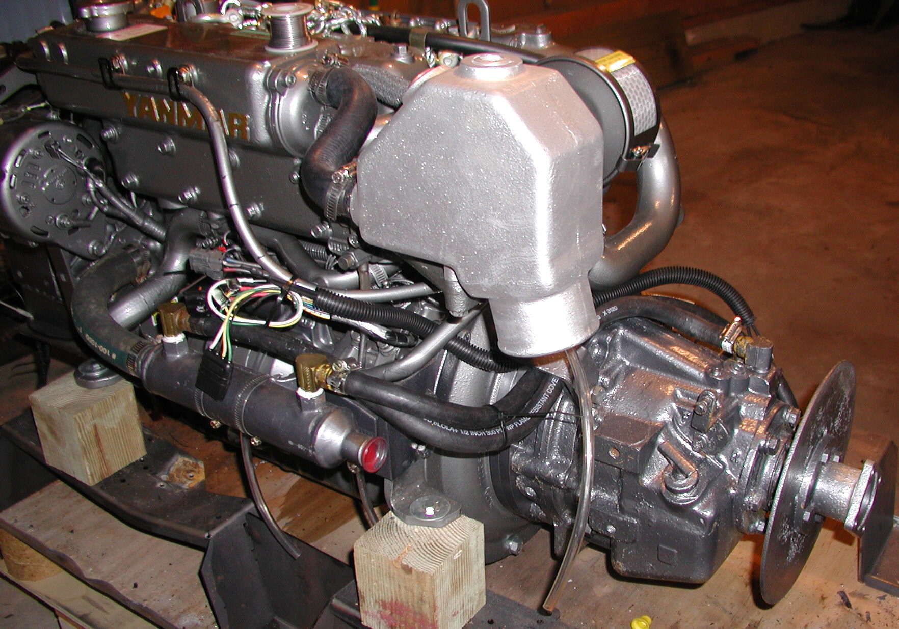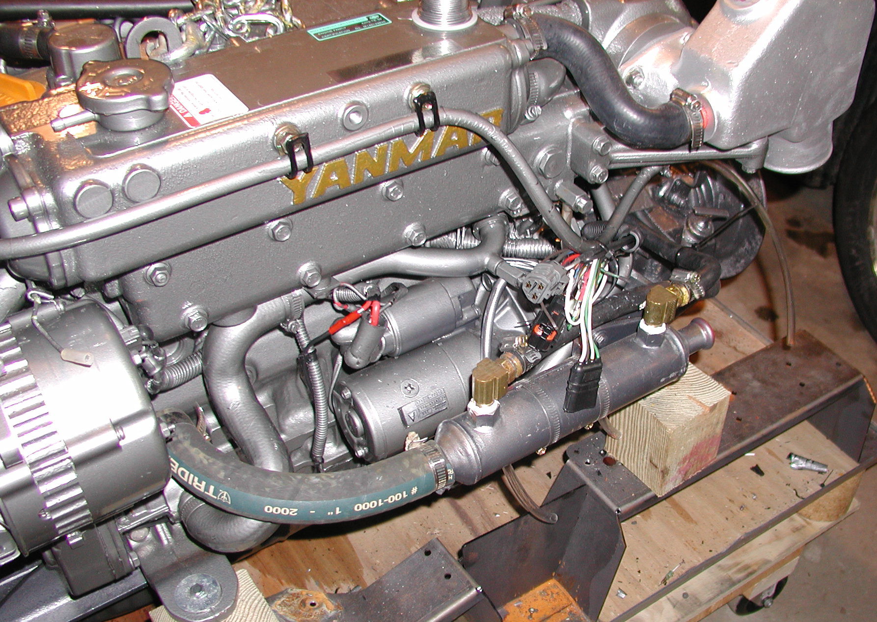 As noted earlier, I purchased the engine with a bell-housing configured for the Velvet Drive. One would think that since Mac Boring distributes both Yanmar engines and the VD transmission, they would know exactly how to configure the engine. There is no provision for a transmission cooler. They suggest adding one to the seawater side of the cooling system. After I received the engine, I found the spacer missing. They forgot to the item but shipped it at once. After I received it, I found an error regarding the width of the spacer. I needed a 1-inch spacer, or more correctly two half-inch spacers. I ordered yet a second spacer ($120). Since I ordered the engine "with a VD bell housing" rather than by part number, I expected them to ship the missing part without charge. After all, this was their error, not mine. They refused to ship the part without receiving additional payment for the second spacer. I consider this to be a deceptive practice and will not recommend their services. I considered taking legal action against Mac Boring, but decided that it was too small an issue to fight over. Another problem with the bell housing is the lack of fasteners. They machined the bell housing with metric threads rather than English threads. This means that I couldn't reuse fasteners from the old engine. At first thought, this probably seems like an easy problem solved by a trip to the hardware store, but the lower two fasteners are long studs, not bolts. Studs must be used because it would be almost impossible to align the six bolt holes if you had to hold the weight of the transmission while trying to align the holes. Instead, the lower two fasteners are used as guides to align the transmission. These studs need to be five inches long. It is difficult enough to find 10MM bolts, let alone studs that long. You can't even find metric bolts long enough to cut and thread. I ended up buying 3/8 inch bolts instead. I cut off the head and tapped one end with the appropriate metric thread. I don't like having studs that are metric on one end and English on the other, but I really had no choice. The die won't take a bite unless the stud end gets tapered on a grinder. Threading the studs was easy once I figured out how to taper the ends using a drill and bench grinder. I purchased a heat exchanger from Great Bay with the appropriate sized 1" hose barbs. I'm not happy with this design. It is seawater cooled, yet lacks a proper clean-out. I'll probably have to back-flush it to clean it. I'm also concerned about the possibility of getting seawater in the transmission should the heat exchanger fail. There are no zincs in any of the heat exchangers. In spite of my concerns, the task of mounting it ended up being easier than I first anticipated. I reused a heat exchanger mounting bracket from the oil cooler on my W60. The end was cut off to make it shorter. I cut and drilled an angle bracket to mount the heat exchanger to the face of the bell housing. Hydraulic hoses for the heat exchanger were reused from the old engine. These hoses were too short. It is a simple and inexpensive task to cut off the old rubber hose and replace it with longer hose. The material is available at most automotive stores for about 20 cents an inch. I made them 22 inches long each. The hose is supposed to attach without any clamps. This didn't look strong enough to me, so I added hose clamps. The old hoses attached with 45 degree elbows. I used 90 degree elbows instead. Opening the cooling system required that I drain the coolant first. In spite of my best efforts, I lost quite a lot on the garage floor. Yanmar identifies a specific coolant for their turbo engines. HavolineŽ Extended Life Coolant, DEX-COOLŽ Code number 7994, colour: ORANGE, available at Walmart. In all, I spent about 8 hours mounting the transmission. Click on the photo below for a larger image. |