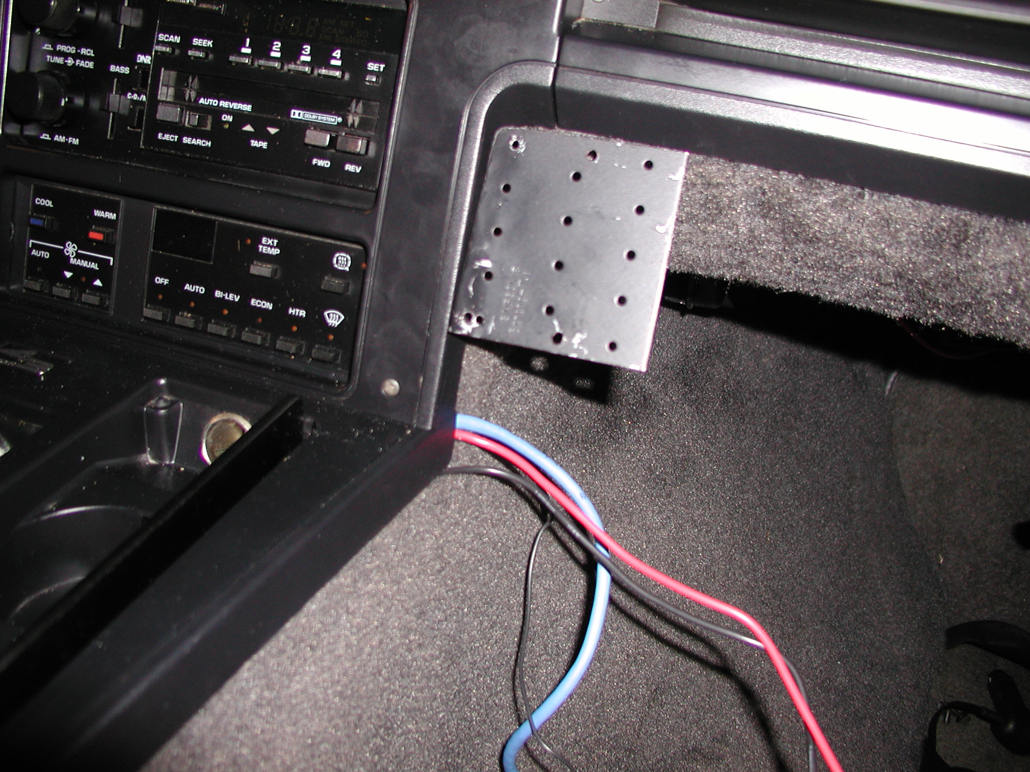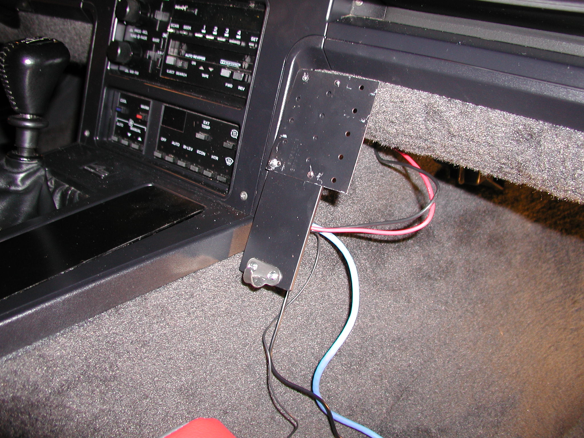 The next problem was locating the radio front-panel. I also wanted to mount an XM radio receiver, so I needed some space for the pair. Pro-Fit makes some nice brackets that work perfectly in my other vehicles, but they don't make one for the Corvette. I ended up making my own bracket from the same steel stock used for the radio body mount. The bracket fastens to the side of the center console through the carpet. The holes are under the dash trim plate however. The bracket is bent under the trim pieces. If the bracket is removed, the holes will be hidden. Having used similar brackets before, I know how frustrating it can be to get nuts behind the bracket, so I also fabricated an aluminum plate with holes pre-drilled and tapped for mounting fasteners. |