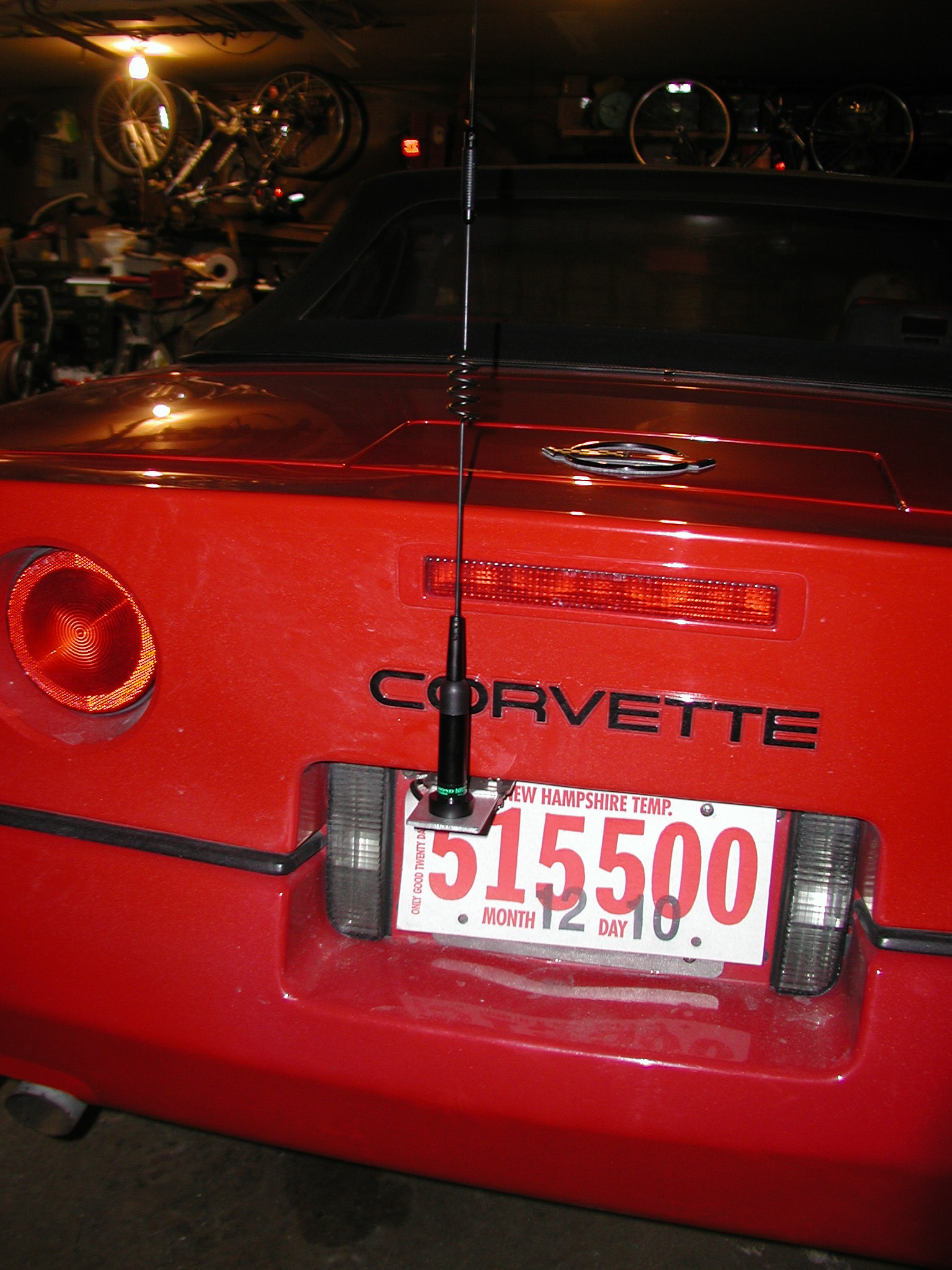 The last problem was to locate the antenna. There is no trunk in this car, and the body is plastic. Since I was unwilling to cut holes, the only way I could think of to secure an antenna was to use a license-plate mount on the rear of the vehicle. Hamstick makes stainless brackets for this purpose. I purchased one from HRO. I cut a tiny hole in the body under the carpet just behing the rear wheel well to pass the feed line to the underside of the rear fender. From there, it routes into the rear bumper and to the bracket. The bracket comes with an antenna mount that bolts to the base plate. I didn't like the size of the plate and didn't want to deal with cutting a larger antenna mount hole in the thick stainless plate. Instead, I cut a new plate from aluminum and mounted an NMO connector to that plate. The antenna is an Diamond NR73BNMO. This antenna requires no groundplane, but I was able to ground the bracket by passing the ground brade through the rear bumper and attach it to part of the frame. The satellite radio antenna has a magnetic base. I stuck it to the top of the radio body. |
